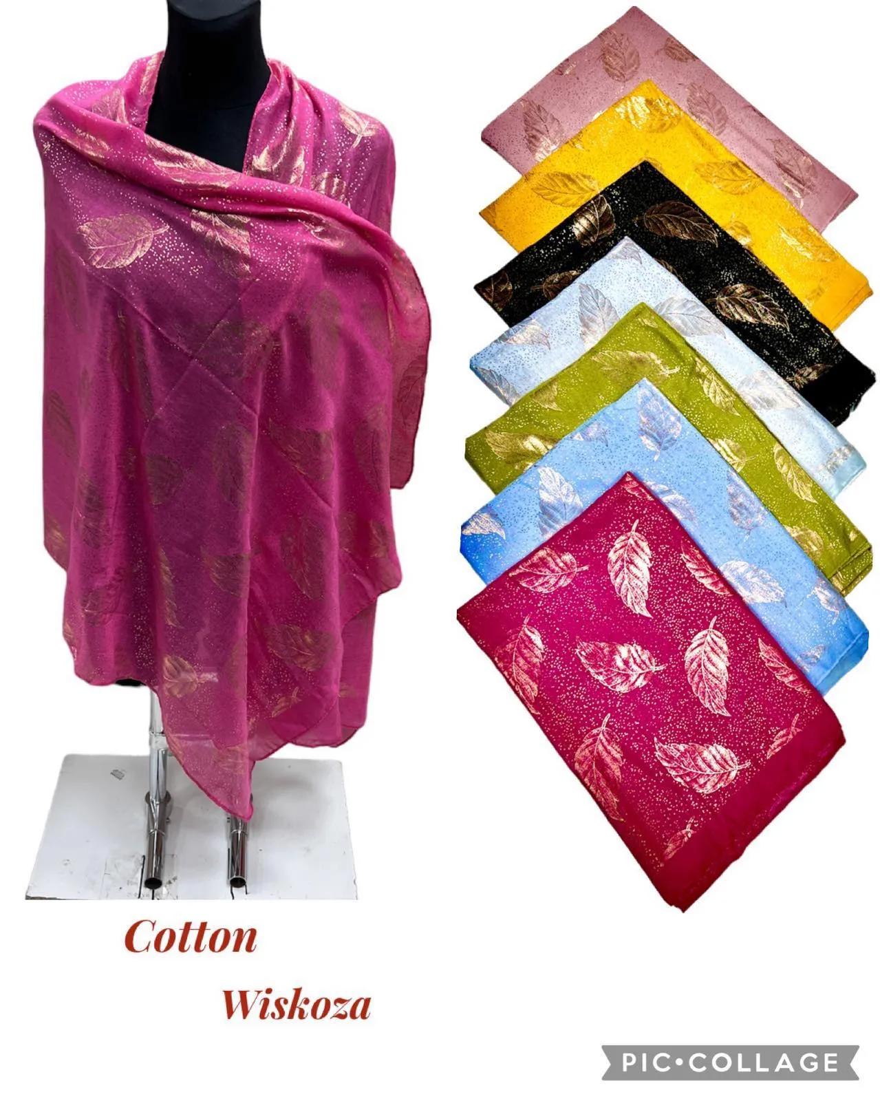 Szalik damski bawełna wiskoza, złoty wzór liście, mix kolorów