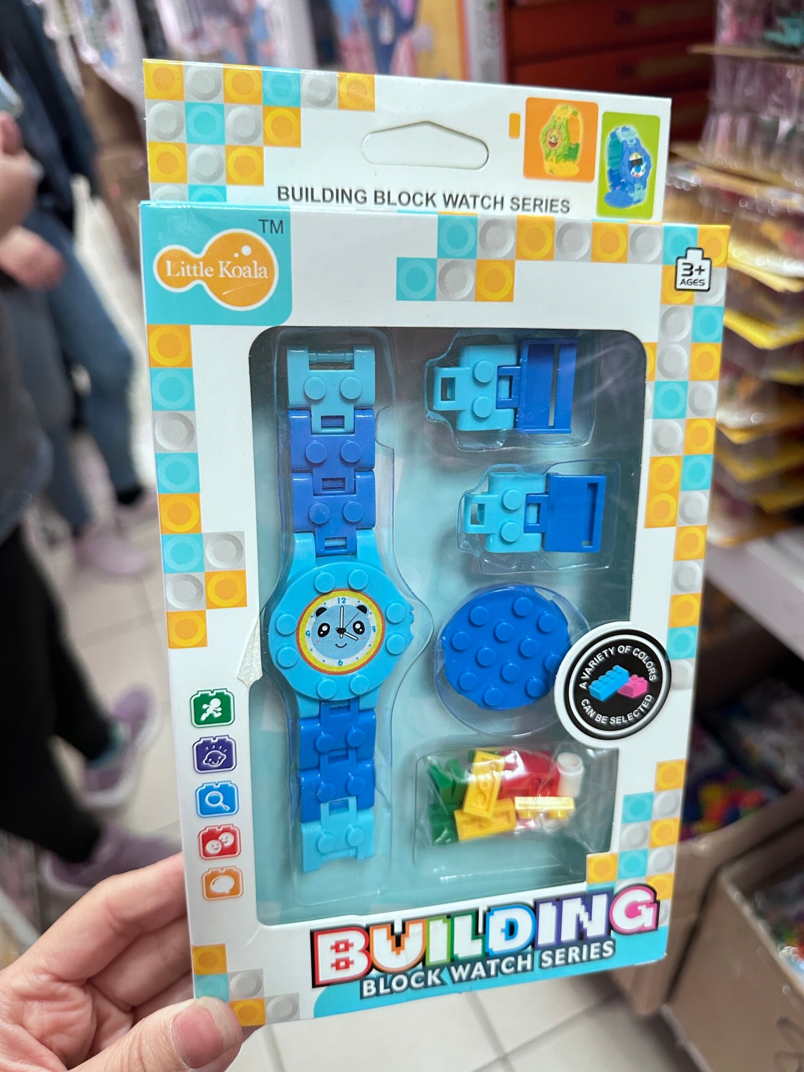 Produkt na zdjęciach to Building Block Watch Series od marki Little Koala, zestaw zegarka w formie klocków konstrukcyjnych, przeznaczony dla dzieci w wieku 3+. Zegarek składa się z elementów, które można dowolnie montować i modyfikować, umożliwiając dzieciom personalizację swojego zegarka. Zestaw zawiera dodatkowe części do budowania oraz opcjonalne elementy, takie jak okulary, które również można dekorować klockami. 🕰️🕶️